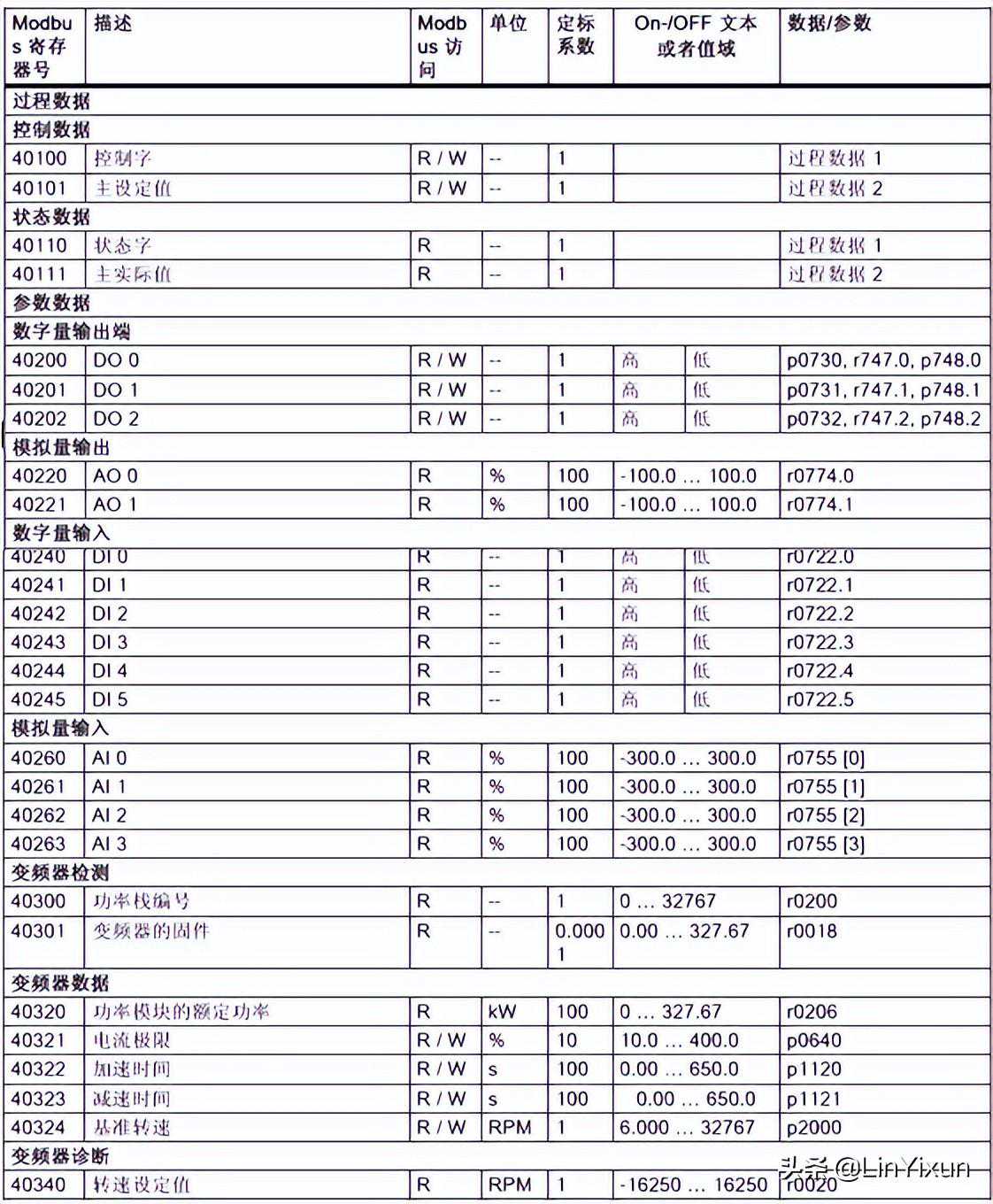控制单元中的Modbus寄存器和对应的参数如下表所示: