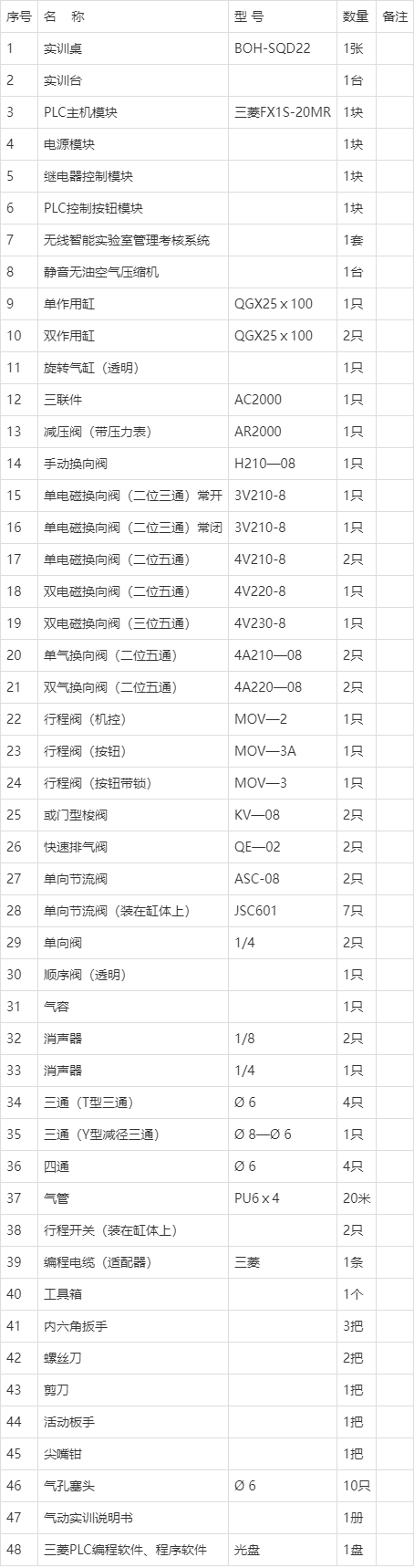 1、BOH-SQD22型气动PLC控制实训装置(工业元件)主要由实训桌及实训台、气动元件和电气控制器件、可编程控制器(PLC)等组件组成。