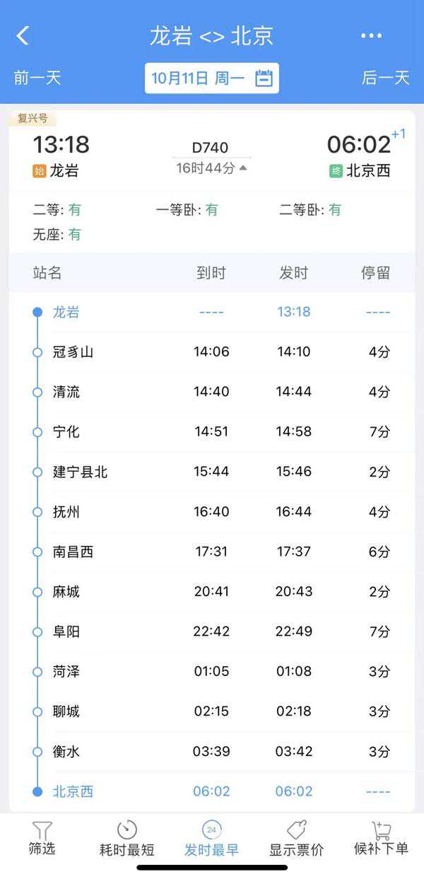 列车从龙岩出发,途经冠豸山、清流、宁化、建宁县北、抚州、南昌西、麻城、阜阳、菏泽、聊城、衡水、北京西,共计12个车站。