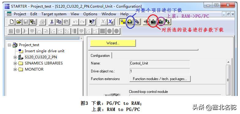下载操作是将PG/PC中保存的参数表下载到RAM中(DownloadCPU/driveunittotargetdevice),就是在线执行下载操作,将PG/PC的参数设置传给控制单元CU,如图3所示。