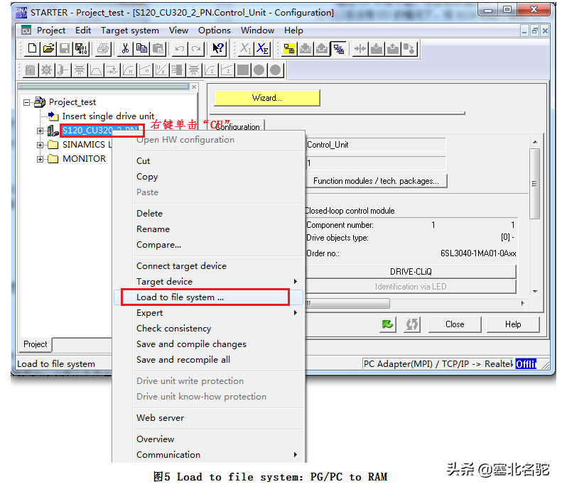 通过CF卡读卡器,将参数表直接从PG/PC装载到CF卡(Loadtofilesystem),这个操作可以在没有CU的情况下,将S120项目下载到CF卡上,如图5所示。