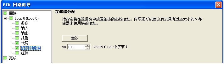 使用PID回路向导进行配置时,在组态界面最后会进行存储器分配,见下图2所示。此处分配的V区地址防止冲突调用,本例中起始地址选择VB0。