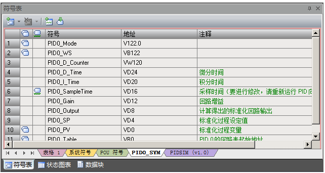 通过查询系统手册中《PID回路和整定》章节,PID回路表占用的存储器V区地址中所代表功能,见表1-PID回路表: