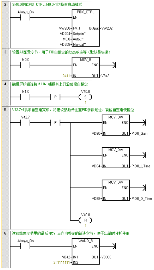 通过程序中判定当=1时表示PID整定已完成,将整定建议的参数传送(move)到PID运行参数里。
