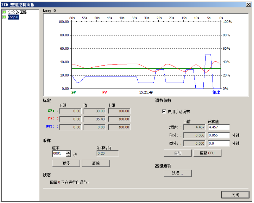 通过程序启动PID自整定(=1)后,可以使用PID整定控制面板监视PID回路的运行,如下图6所示: