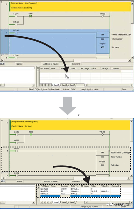 •通过拖动梯形图程序段窗口将其放到监视窗口来输入地址。通过拖动程序条头,可输入该程序条上的所有地址。