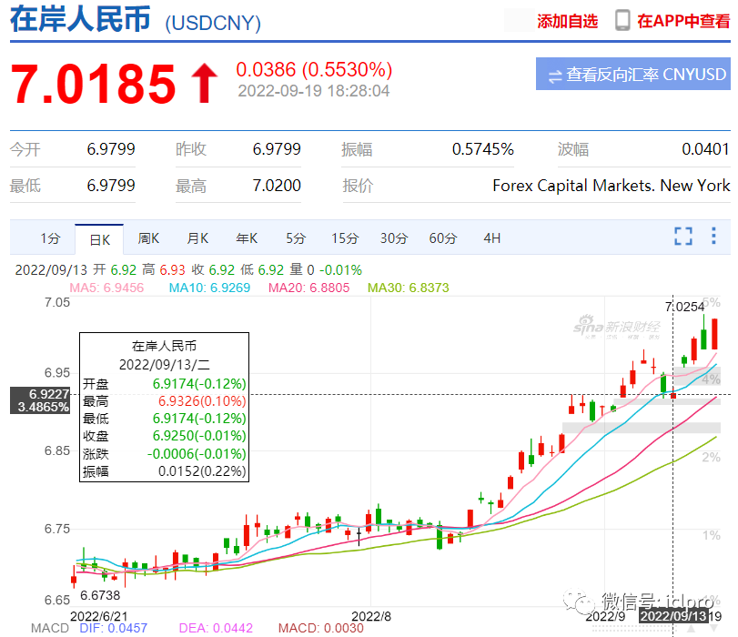5.本周在岸人民币对美元汇率大幅升值,截止9月19日,在岸人民币对美元汇率报7.0103,同比上周二收盘价6.9250,升值853个基点