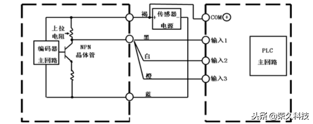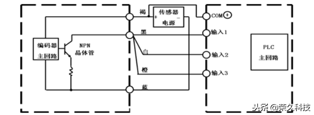 编码器的褐线接电源正极,输出线依次接入PLC的输入点,蓝线接电源负极,再从电源正极端拉根线接入PLC输入com端。