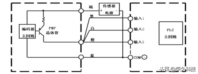 具体接线方式如下:编码器的褐线接电源正极,输出线依次接入PLC的输入点,蓝线接电源负极,再从电源正极端拉根线接入PLC输入com端。