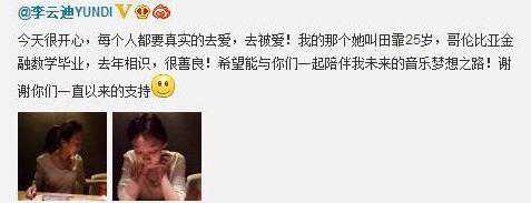 同一天,李云迪官宣来自哥大的田霏↓