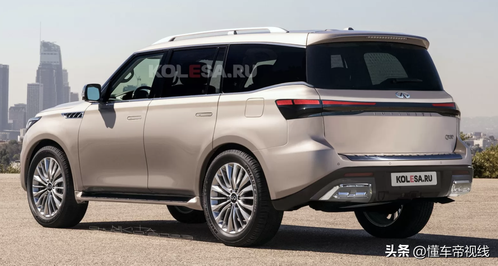 在海外媒体绘制的假想图中(非官方制作),全新英菲尼迪QX80外观造型与QX60相似,车头采用大尺寸进气格栅,并设计有分体式大灯组,车尾配备有细长的尾灯,并在后保险杠区域加入镀铬装饰。