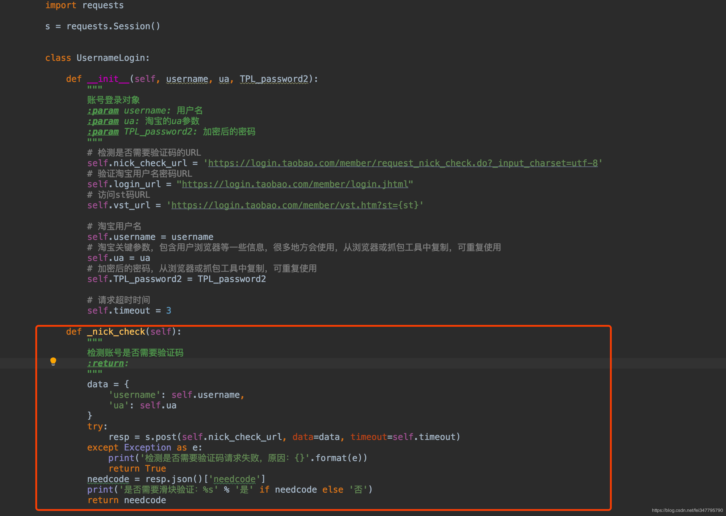 importreimportosimportjsonimportrequests'''遇到不懂的问题?Python学习交流群:821460695满足你的需求,资料都已经上传群文件,可以自行下载!'''s=()检测是否需要验证码的_check_url=''访问st码_url='{}'淘宝用户名=username加密后的密码,从浏览器或抓包工具中复制,可重复使用_password2=TPL_password2登录提交的数据,如果登录失败,可以从浏览器复制你的formdataverify_password_data={'TPL_username':,'ncoToken':'cdf05a89ad5104403ebb12ebc9b7626af277b066','slideCodeShow':'false','useMobile':'false','lang':'zh_CN','loginsite':0,'newlogin':0,'TPL_redirect_url':';imgfile=comm=allssid=s5-esearch_type=itemsourceId===utf8initiative_id=tbindexz_20170306','from':'tb','fc':'default','style':'default','keyLogin':'false','qrLogin':'true','newMini':'false','newMini2':'false','loginType':'3','gvfdcname':'10','gvfdcre':'68747470733A2F2F6C6F67696E2E74616F62616F2E636F6D2F6D656D6265722F6C6F676F75742E6A68746D6C3F73706D3D61323330722E312E3735343839343433372E372E33353836363032633279704A767526663D746F70266F75743D7472756526726564697265637455524C3D6874747073253341253246253246732E74616F62616F2E636F6D25324673656467125334425323545392532353830253235394625323545352532354241253235439253235383025323539462532354535253235424125323546D6766696C65253344253236636F6D6D656E64253344616C6C2532367373696425334473352D652532367365617263685F747970652533446974656D253236736F75726365496425334474622E696E64657825323673706D253344613231626F2E323031372E3230313835362D74616F62616F2D6974656D2E31253236696525334475746638253236696E69746961746976655F69642533447462696E6465787A5F32303','TPL_password_2':_password2,'loginASR':'1','loginASRSuc':'1','oslanguage':'zh-CN','sr':'1440*900','osVer':'macos|10.145','naviVer':'chrome|76.038091','osACN':'Mozilla','osAV':'5.0(Macintosh;IntelMacOSX10_14_5)AppleWebKit/537.36(KHTML,likeGecko)Chrome/76.0.3809.100Safari/537.36','osPF':'MacIntel','appkey':'00000000','mobileLoginLink':';imgfile=comm=allssid=s5-esearch_type=itemsourceId===utf8initiative_id=tbindexz_20170306useMobile=true','showAssistantLink':'','um_token':'T898C0FDF1A3CEE5389D682340C5F299FFE590F51543C8E3DDA8341C869','ua':}try:response=(_password_url,headers=verify_password_headers,data=verify_password_data,timeout=)_for_status()提取申请st码urlapply_st_url_match=(r'scriptsrc="(.*?)"/script',)加载cookies文件ifself._load_cookies():returnTrue登录成功,提取跳转淘宝用户主页urlmy_taobao_match=(r'="(.*?)"',)ifmy_taobao_match:print('登录淘宝成功,跳转链接:{}'.format(my_taobao_(1)))self._serialization_cookies()returnTrueelse:raiseRuntimeError('登录失败!response:{}'.format())def_load_cookies(self):2、加载=self._deserialization_cookies()提取淘宝昵称nick_name_match=(r'inputid="mtb-nickname"type="hidden"value="(.*?)"/',)ifnick_name_match:print('登录淘宝成功,你的用户名是:{}'.format(nick_name_(1)))returnnick_name_(1)else:raiseRuntimeError('获取淘宝昵称失败!response:{}'.format())if__name__=='__main__':淘宝重要参数,从浏览器或抓包工具中复制,可重复使用ua=ua='119加密后的密码,从浏览器或抓包工具中复制,可重复使用TPL_password2='8a65e84dbd099e3eb728bfbbbf6ecb2b759b50745120e186ad94b171e369dac0d877d0c816d49898ea166d2842469dcec0435e88d4f534ee502967eafd30976ca0424f9c4a65bfb8b27c1cd8cf68a3c94be4fb7bd4102095f34cfbfca2649eee9ac3ee3d2785789fc4de15279cfab6d6984c90ab557bb1ee83c187a4fd25698d'ul=UsernameLogin(username,ua,TPL_password2)()