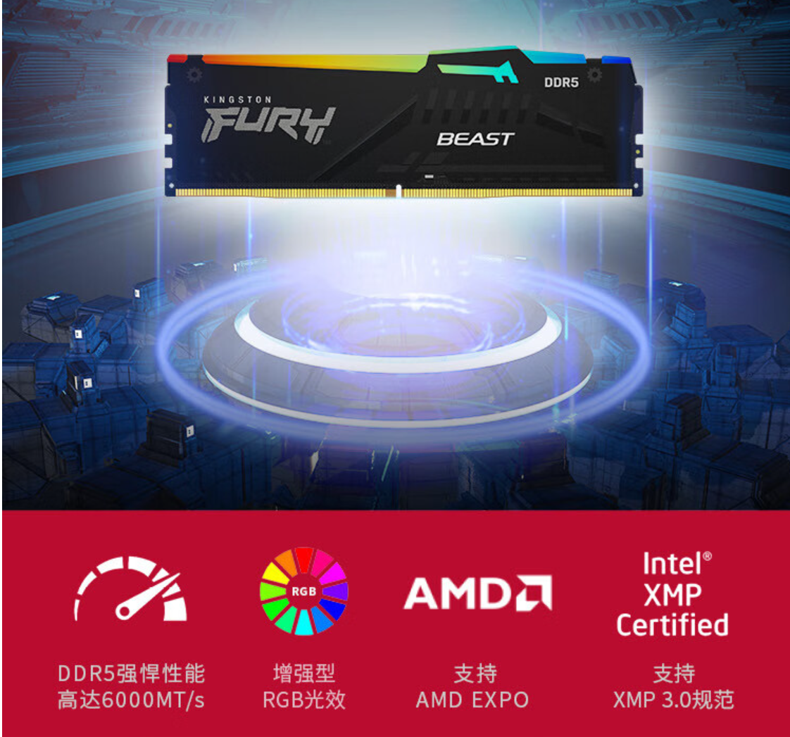 由于这次的AMD终于有了自己的内存超频规范EXPO,所以内存最好买支持EXPO的,不过一上市很多厂家还没做认证,所以我选了金士顿的6000频率的,自己再用的是那款不带RGB的5600频的,也挺好用,主要这款带RGB