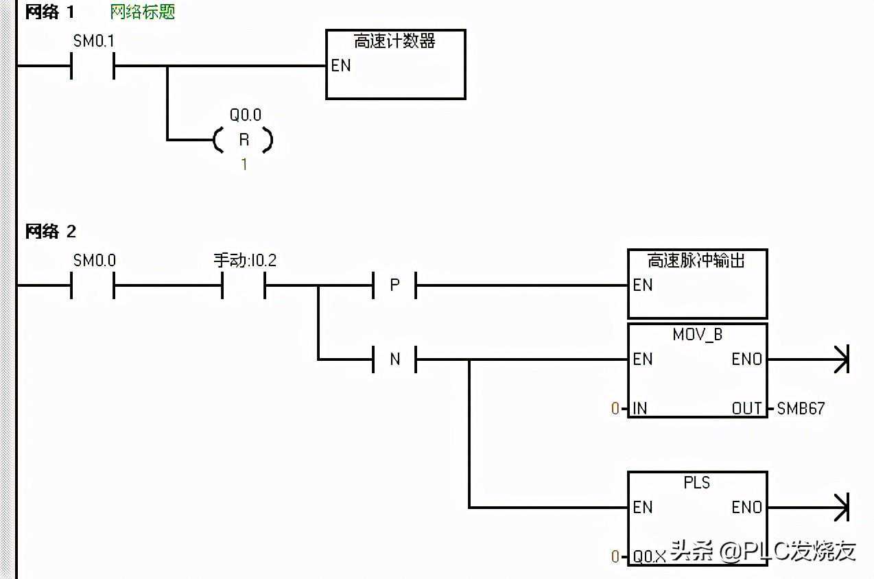 以上的程序,在主程序的网络一中,首先用首次扫描驱动高速计数器子程序进行高速计数初始化,同时对的过程映像区清零。在高速计数器子程序中,首先传送1685到SMB67中定义控制字节,这里选择的是PTO模式、单段、1us/周期、装入周期和脉冲数的情况(控制字节的定义可以参考PTO/PWM控制字节表),并传送100到SMW68中写入周期值,传送100到SMD72中写入脉冲数,最后执行PLS指令。