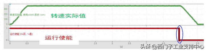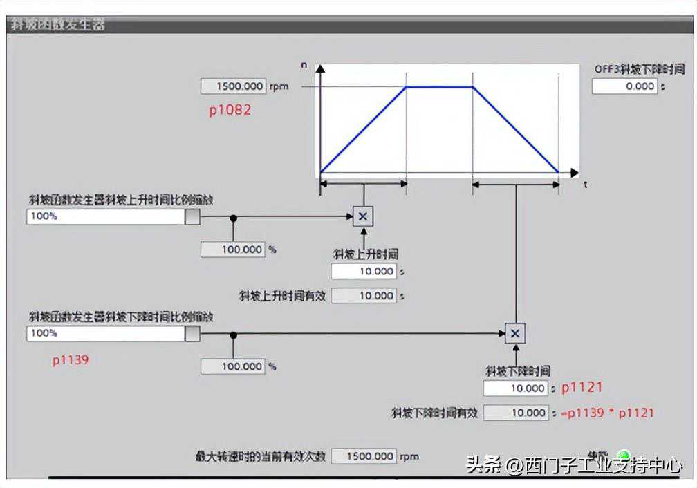 设置参数p1121、p1139。在该时间内斜坡函数发生器的转速设定值从最大转速(p1082)运行到静止(设定值=0),如下图举例所示。