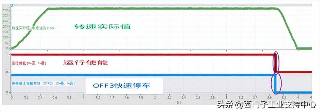 OFF3停车:称为快速停止,变频器驱动电机按斜坡下降时间(p1135)进行制动,达到静态后变频器会关闭电机。