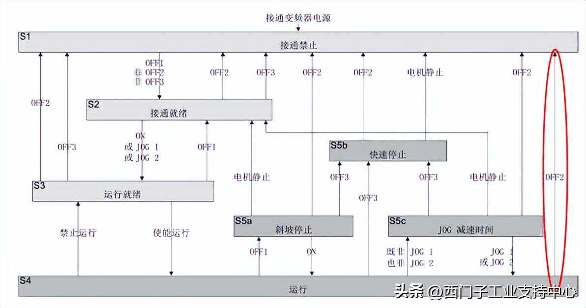 2)当变频器处于S4运行状态时,变频器会按着OFF1斜坡下降时间进行制动,电机静止后切换为S2接通就绪。