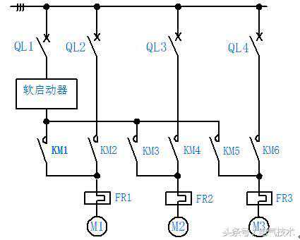 图2一台软启动器驱动三台电机控制原理图