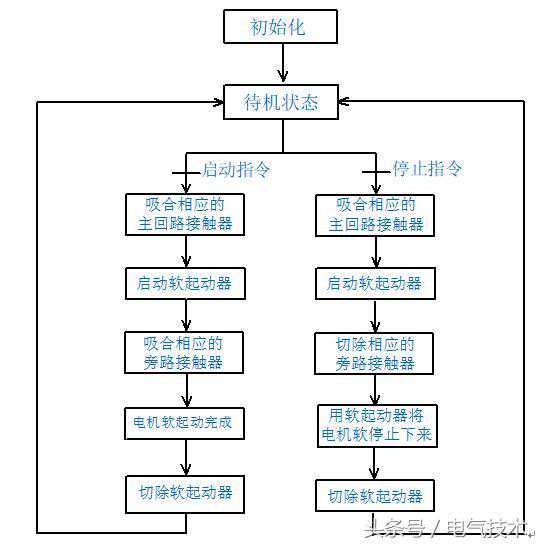 当软启动器的输出电压达到电动机的额定电压时,电动机达到额定转速,启动完成。停机时,根据设定的停机时间逐步降低软启动器的输出电压,电动机逐渐停止运行。以实现电动机的软停止。