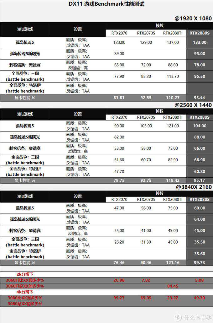 下面详细分析下DX11的5款游戏从1080p到4k分辨率的具体表现。RTX3060TI在2k分辨率下大概是RTX3070的90%性能。