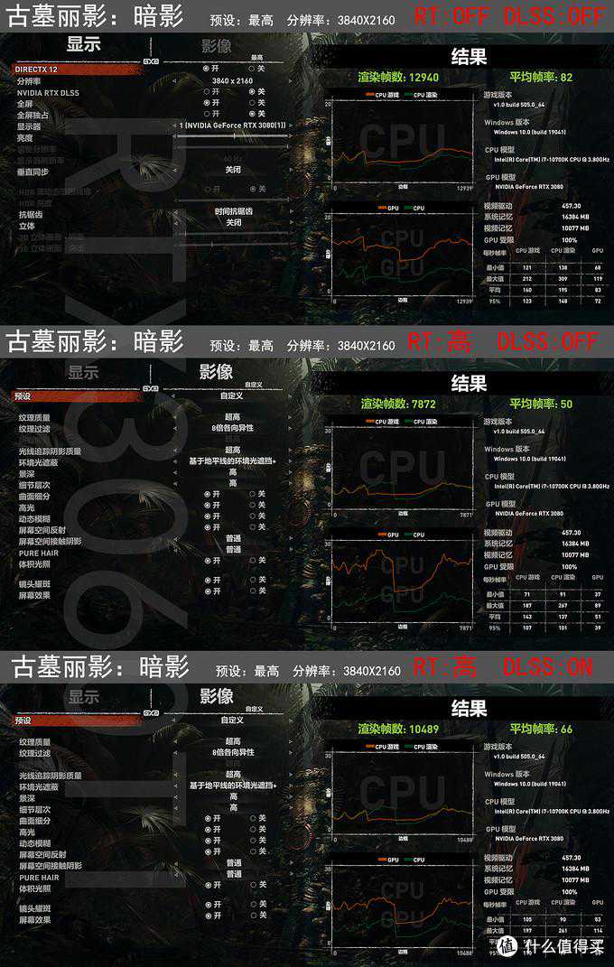 古墓丽影:暗影,RTX3080在DLSS的帮助下4k分辨率可以在最高画质和最高光追特效下流畅游戏。