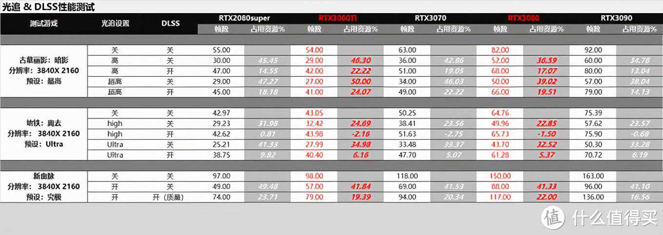 ▼做个表格,占用资源%就是开启特效后帧数下降的百分比。在古墓丽影:暗影中新RT和TensorCore发挥并不大好,RTX3070上占用资源还要多于RTX2080S;但在地铁和新血脉的测试中RTX30系列显卡还是有些优势,看来驱动还有很多工作要做。