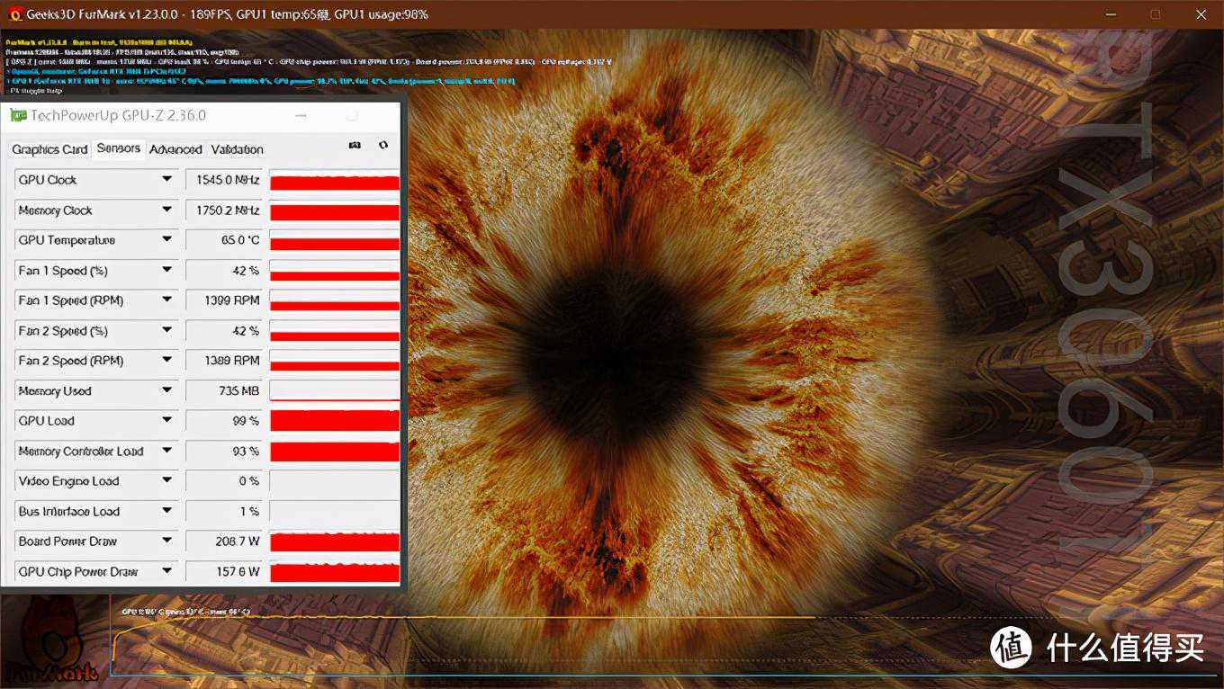 Furmark烤机测试,参数设定为1920*1080分辨率、0AA,10分钟后频率减少到了1545MHz,可以看到GPU-Z显示的功耗为209w,温度稳定在65度附近。