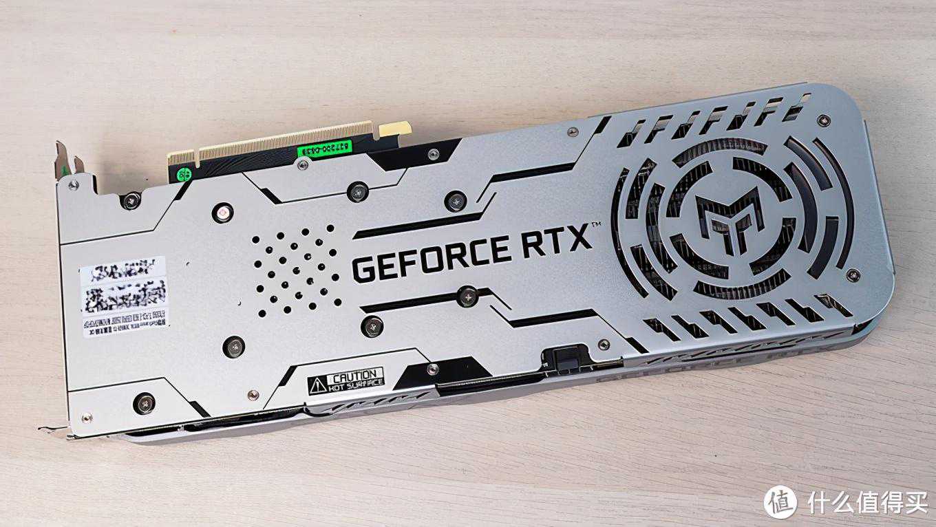 背面有金属背板,同样是采用了撞色设计,中间的显卡核心位置有镂空设计,避免核心温度因为背板阻挡而堆积,在一定程度上改善显卡的散热。