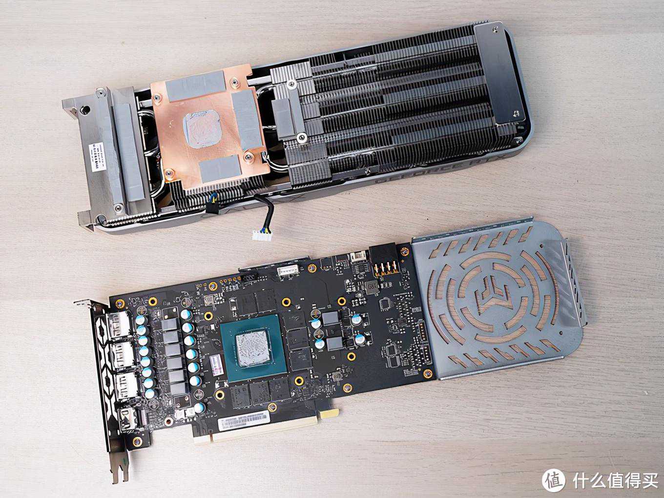 拆解下显卡,散热反面采用了7条冰脉复合热管,和核心接触部分为纯铜镀镍均热板。显存、MosFET都设计有导热贴;供电方面,索泰一直以堆料而闻名,这张X-GAMINGOC定位并非顶级,但也采用了16相供电,每一相由2颗固态电容,一个安森美DrMOS以及一个电感组成。