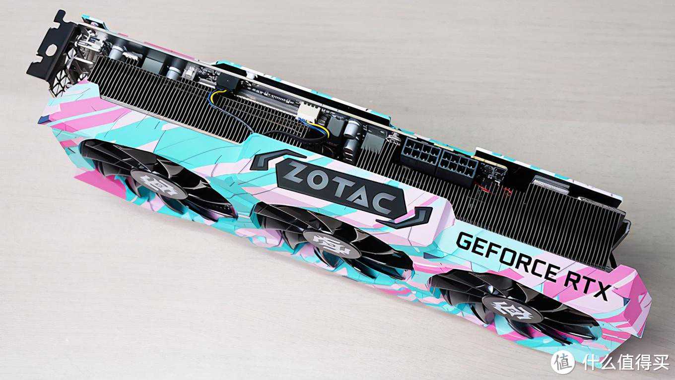 这张显卡风扇罩采用了粉色和蓝色的撞色设,非常有活力的感觉,后期还推出更多个性化定制的版本供玩家们选择。显卡侧面有英伟达GEFORCERTX字样,中间ZOTACLOGO是有RGB灯效的。