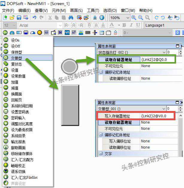 然后,就是打开台达的HMI软件,新建一个项目,然后就开始做画面,在画面上选择一个交替型的按钮,这个按钮就是按一下为1,再按一下为0,将其关联到。再绘制一个指示灯,关联到。见下图: