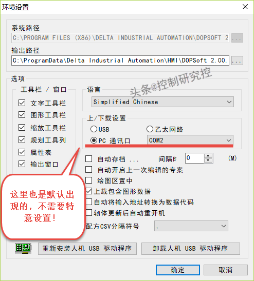 这个界面其实和你新建一个项目时弹出的界面是一样的,这只设置了COM2,因为新建项目时候系统默认开启的是COM2端口,COM1和3是没有被激活的。---此处这个COM2指的是台达触摸屏上的COM2,而不是电脑上的。强调这一点是因为,在线模拟的时候其实是把电脑就当做触摸屏了,此处页面上COM2是需要关联到PC电脑的真实COM口的,可以是COM1,2,3,4,5等等等等!