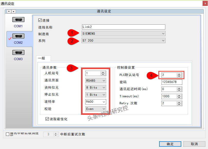 需要提一点的就是3处的人机站号,默认是0,0是不行的,因为台达的手册上写了这里必须是一个大于0的值!4处的PLC站号,熟悉200PLC的都知道扫描的时候一般扫出来它是2。