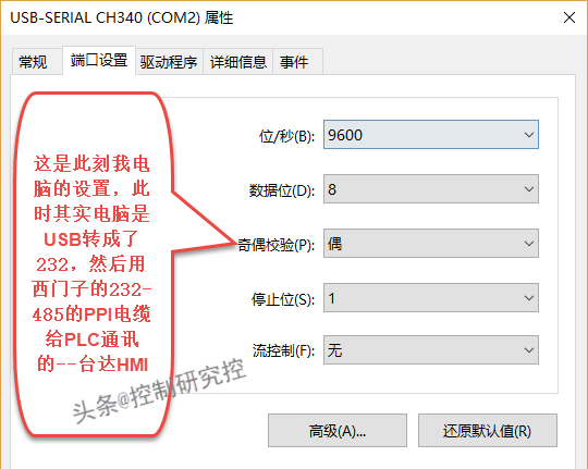 这个图片和上边红色尖圆3中的通讯界面选择的是RS485对应来说的,我是想说我实际使用的线是USB-232的,然后被西门子的线转成了485的,所以这里选成了485也通讯上了。---我还测试了一下,界面选择如果改成RS232照样是可以通讯成功的!