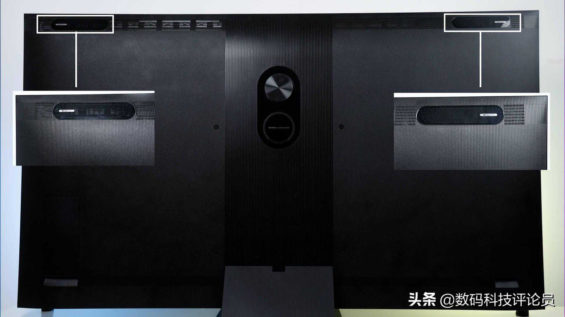 背板看过去也是整洁干净,平整的背面没有多余的点缀。而在电视背部靠上位置的的两侧,各配置了一枚扬声器,背部支架上还配有一枚独立低音大音腔,这样的设计自带立体声。