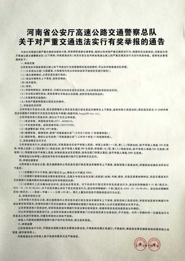 自发布《河南省公安厅高速公路交通警察总队关于对严重交通违法实行有奖举报的通告》以来,发动群众对省内高速公路上的九类交通违法进行举报,截至目前,高速交警总队接到群众举报交通违法车辆近500台次,证据有效的交通违法举报148台次,奖励1.5万余元。
