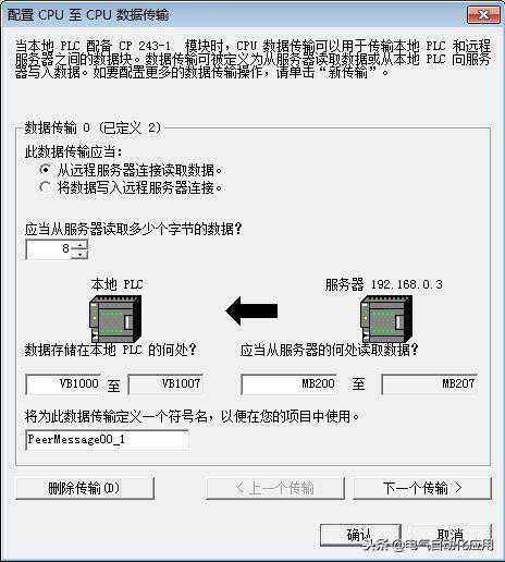 注意:本地PLC中的地址必须是V内存字节地址,远程对象中的地址必须代表字节地址。当您为S7-300/S7-400设备输入远程地址时,若是数据块请使用格式。