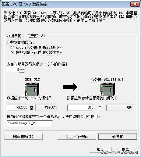 选择"数据传输"标记,并单击"新传输"按钮,进行配置:选择是读取数据还是写入数据,填写通讯数据的字节个数,填写发送数据区和接收数据区的起始地址。
