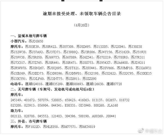 小型汽车:苏J3Y017、苏J5R968、苏JAA910、苏JXB397、苏JZ8980、苏JZP973、苏JZW628