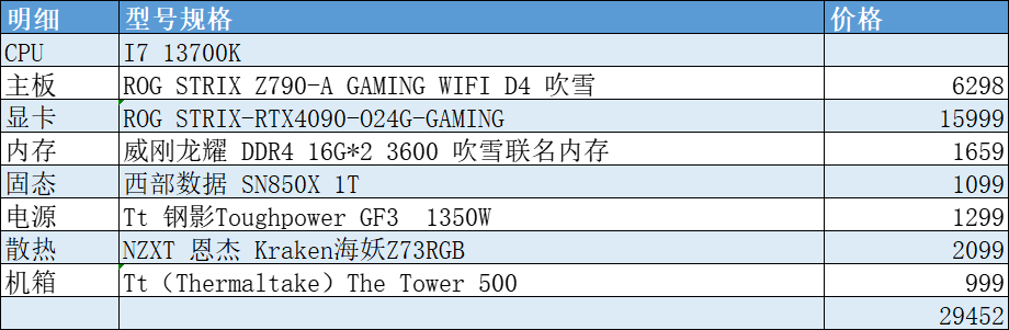 这套除了CPU都是顶配了,毕竟现在13900K的价格不是太合适,13700K如果只打游戏的话是没什么太大问题的