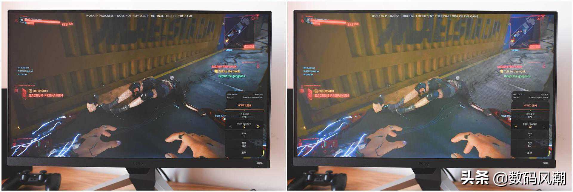EX2710直接预设了三种带有HDRi的游戏模式,具体效果如何?我觉得更多就是在HDR的基础上,做出一些倾向性的设定,比如FPS的BlackeQualizer功能,这并不是一般游戏显示器具备的功能,这种类似于提高对比度和暗部细节的处理方式确实有点“物理作弊”的感觉,并且10档的调节可调的宽容度挺广的。