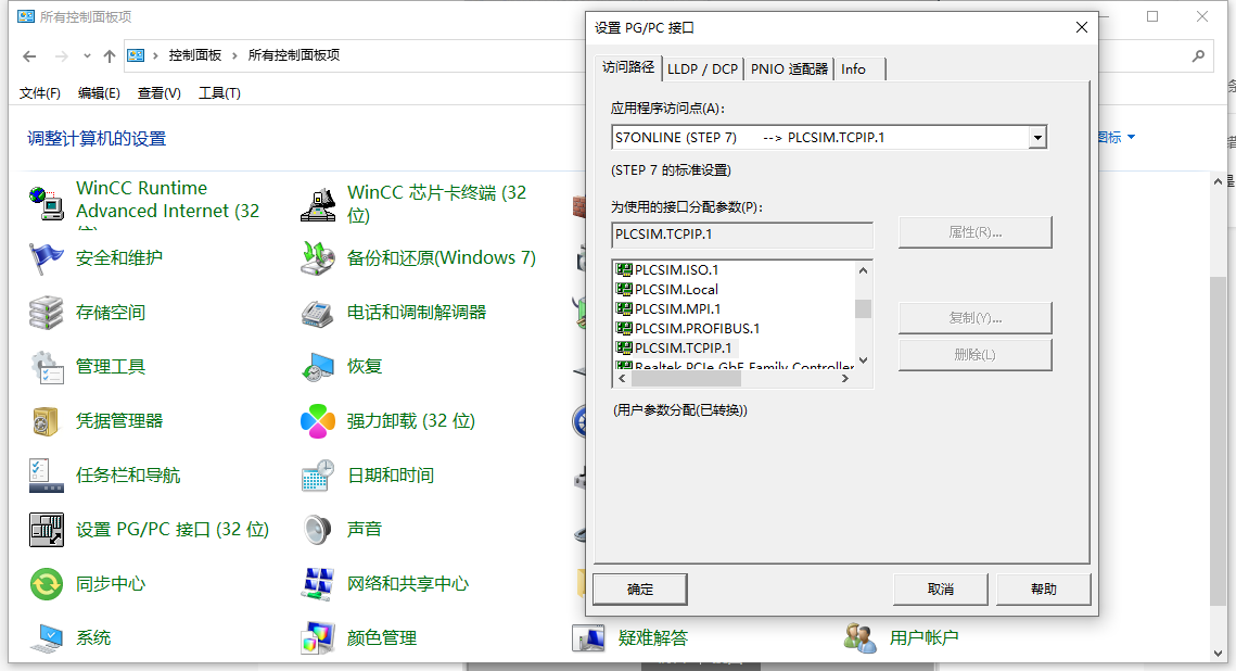 6.在控制面版设置PC/PG接口,将应用程序访问点设置成STONLINE(STEP7)--;