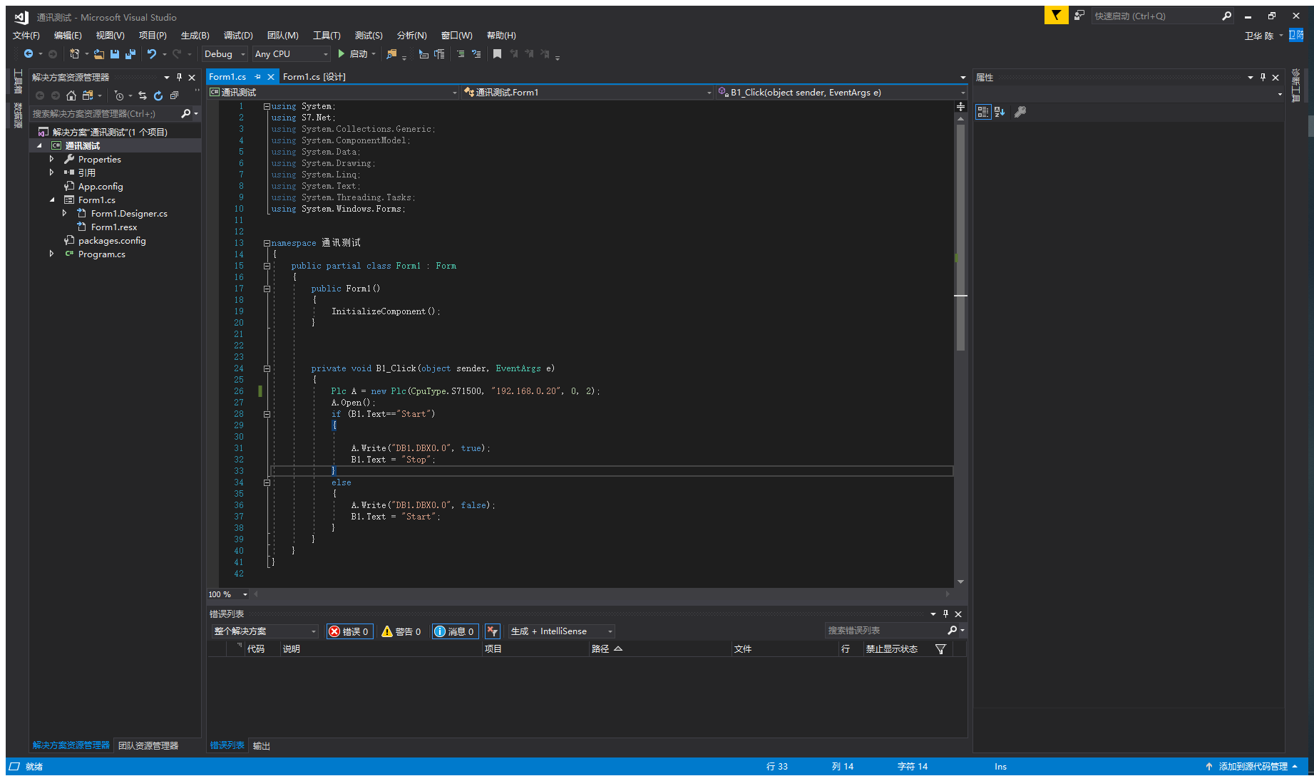 9.打开昨天编写号的VS2017程序进行测试,注意连接的IP地址为192.168.0.20而不是192.168.0.1;