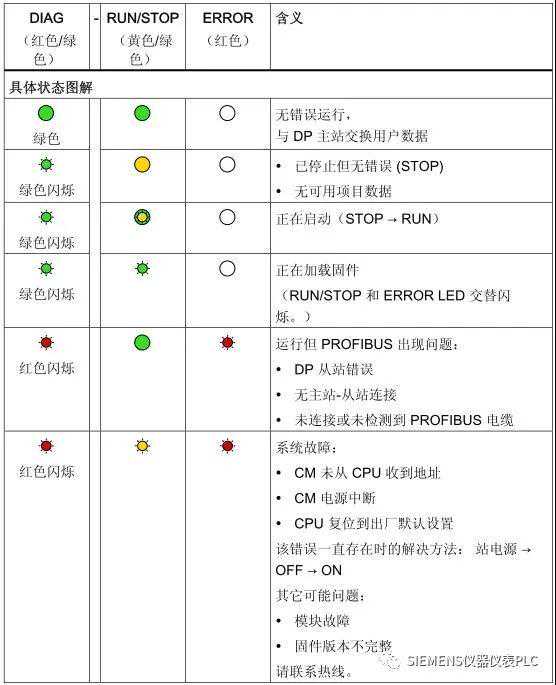 前面板上的DIAG灯,绿色正常,有错误和问题时提示为红色。上盖后面的RUN/STOP、ERROR和前面板的DIAG灯相组合,给出模块状态:
