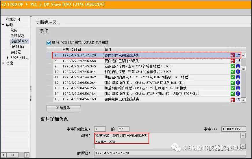 较新版本的CM1243-5例如版本在TIAV13SP1中查看诊断缓冲区里从站丢站的信息记录如下: