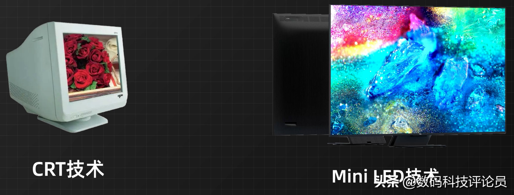 而MiniLED则把是把一整块背光模块,缩小成一颗颗50-200微米之间的LED小灯珠,并且可以单独控制开关,大家可以脑补一下,同样是显示一页内容,一边是一整块背光整体开关,另外一边是像素点单独控制小灯珠开关,很明显MiniLED控光精细程度会比LED电视高得多。