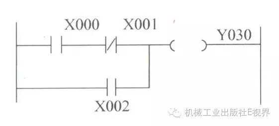 对输入信号和被控制对象必须标上相应的标志符和地址码,如图4(与或门)中的X000、X001、X002和Y030。图中所表示的逻辑关系为