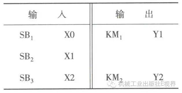 停止按钮SB1、正传起动按钮SB2、反转起动按钮SB3这3个外部按钮须接在PLC的3个输入端子上,可分别分配为X0、X1、X2来接收输入信号;正转接触器线圈KM1和反转接触器线圈KM2须接在两个输出端子上,可分别分配为Y1和Y2。共需用5个I/O点,如表4所示。