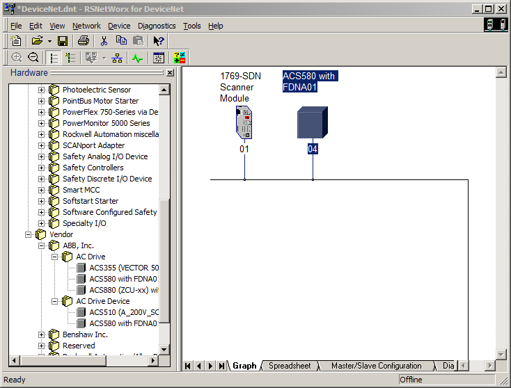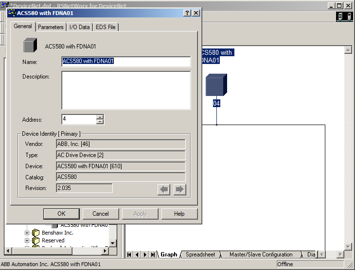 a.打开RSNetWorkforDeviceNet软件,建立好网络组态并导入需要的EDS文件,EDS文件与变频器型号与版本号相关,注意选对文件