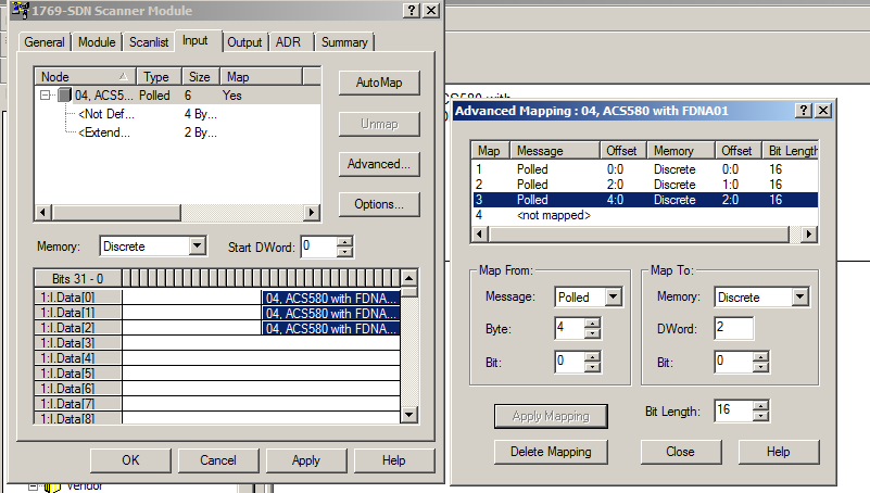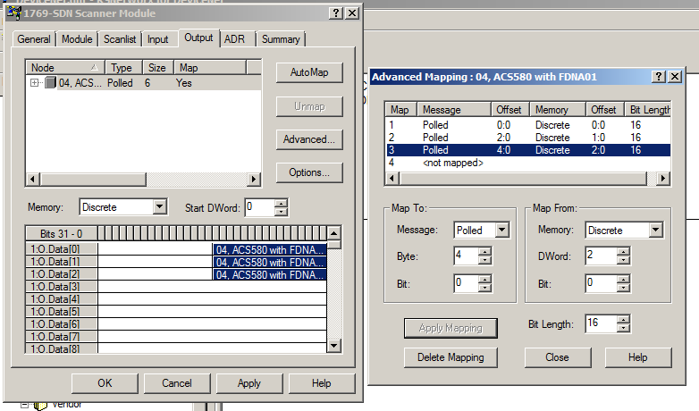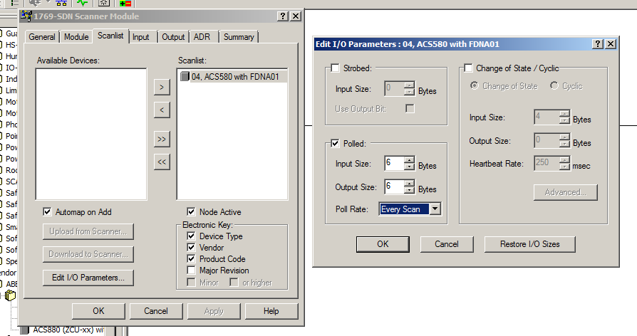 d.双击DeviceNetScanner的图标,配置Scanlist。将变频器加入到Scanlist中。双击变频器名称,配置轮询数据长度,此例中Input和Output均为6Bytes,因为使用了802,852instance。如果需要使用其他instance请参阅手册。
